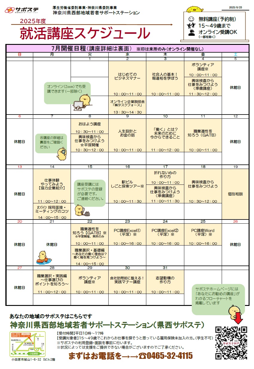 2025年7月の講座日程を公開しています。7月は平塚でWord、Excel講座を開催します。